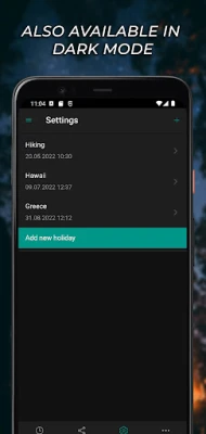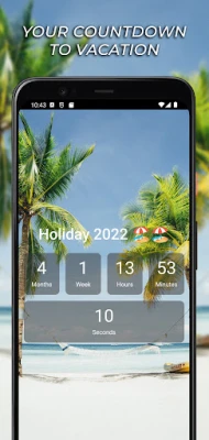 Предстоящата ви ваканция е съвсем близо! Нека това приложение се погрижи да брои дните вместо вас, за да можете вие истински да очаквате с нетърпение следващата си почивка. Отпуснете се и се насладете на времето си, докато ние следим оставащите дни до мечтаното пътуване.