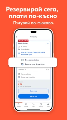 Насладете се на пълна гъвкавост и спокойствие при всяка резервация. С GetYourGuide можете да запазите желаната дейност сега и да платите по-късно, като същевременно получавате моментално потвърждение, дори за last-minute планове. Всичките ви билети са лесно достъпни офлайн на вашето мобилно устройство, гарантирайки безпроблемен достъп навсякъде и по всяко време. В случай на въпроси или промяна в плановете, нашата 24/7 многоезична поддръжка и опцията за безплатно анулиране до 24 часа преди събитието ви осигуряват несравнимо удобство и сигурност. GetYourGuide превръща всяко ваше желание в реалност, създавайки спомени, които ще останат завинага.