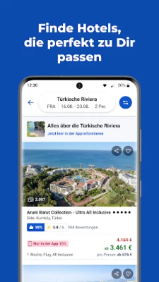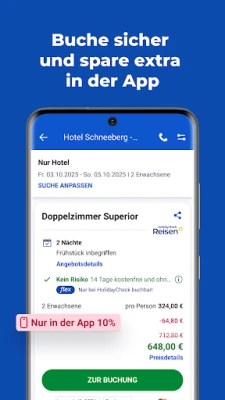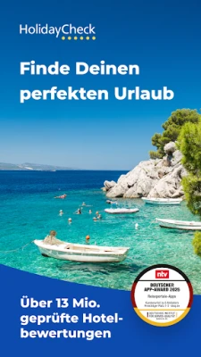 "HolidayCheck: Urlaub & Hotel" е твоето приложение за изгодни пътувания. Открий най-добрите оферти за хотели и почивки, спести до 800€ на пакетни екскурзии и се възползвай от ексклузивни отстъпки. Сравни цени и прочети реални отзиви, за да резервираш своята мечтана почивка.